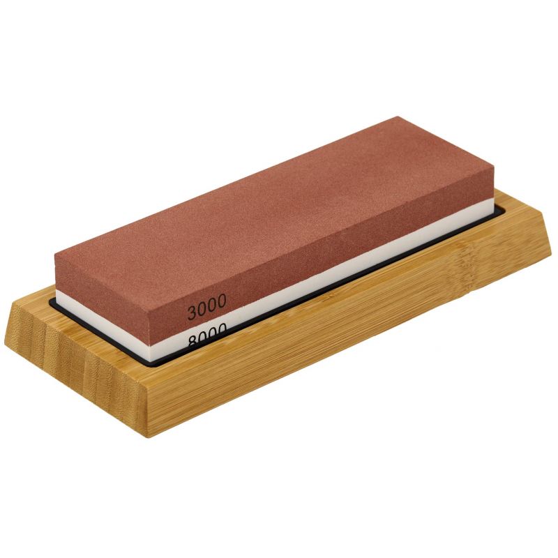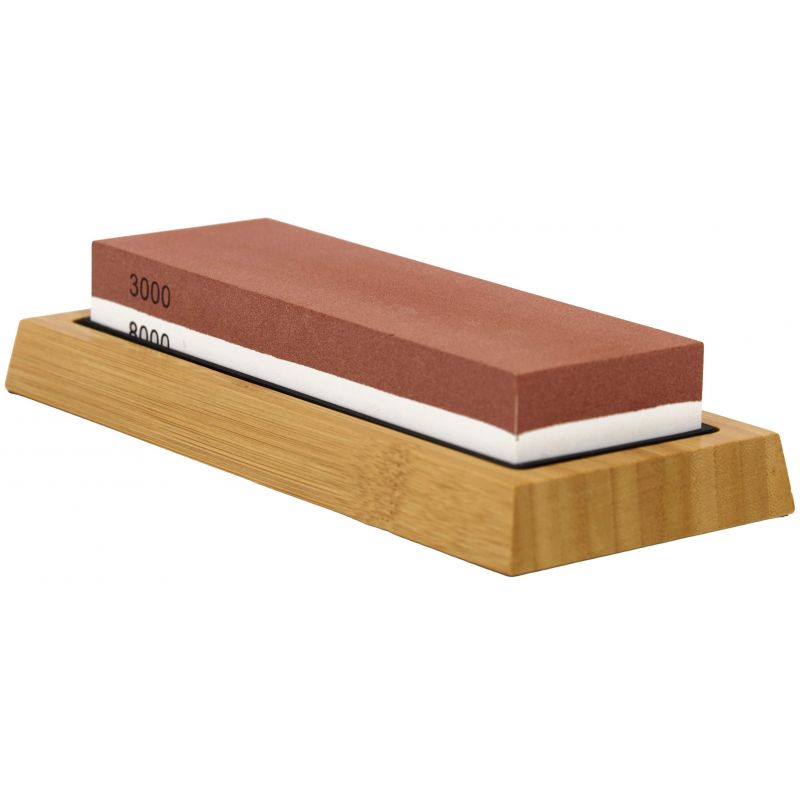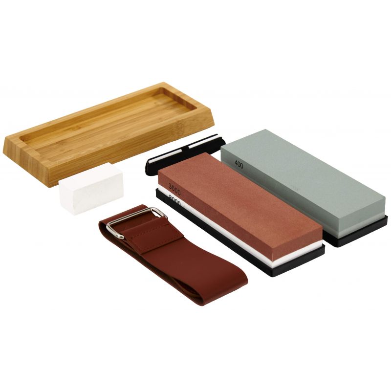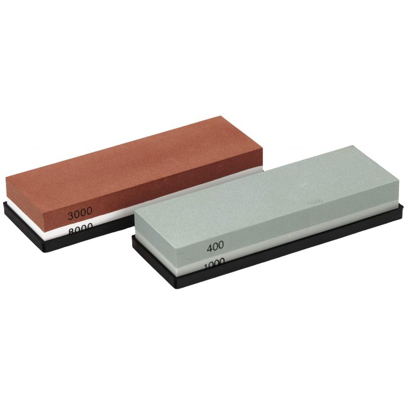 Kamienie wodne zostały wykonane z wysokiej jakości korundu i posiadają różne gradacje, co pozwala na kompleksowy proces ostrzenia – od wstępnej naprawy krawędzi po dokładne wygładzenie i polerowanie. W zestawie znajdują się kamienie o gradacjach 400/1000 oraz 3000/8000. Najniższa gradacja 400 służy do ostrzenia wstępnego i regeneracji uszkodzonych ostrzy, 1000 do wygładzenia krawędzi tnącej i codziennego ostrzenia, natomiast wyższe gradacje 3000 oraz 8000 umożliwiają precyzyjne wykończenie i wypolerowanie ostrza.