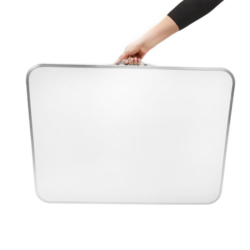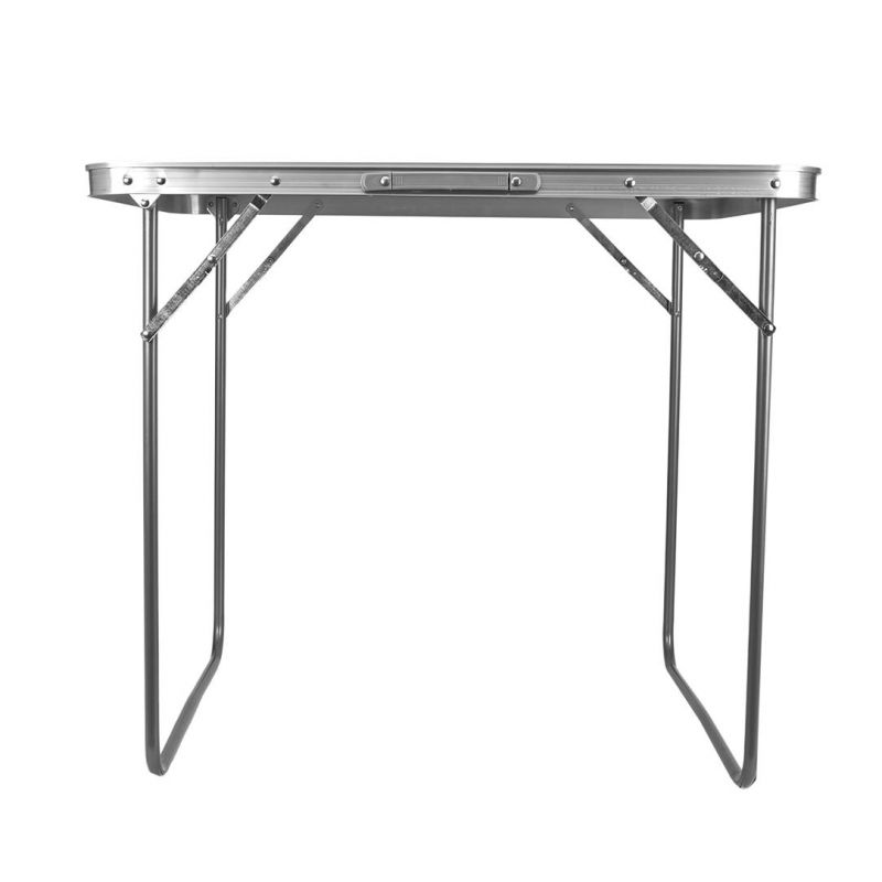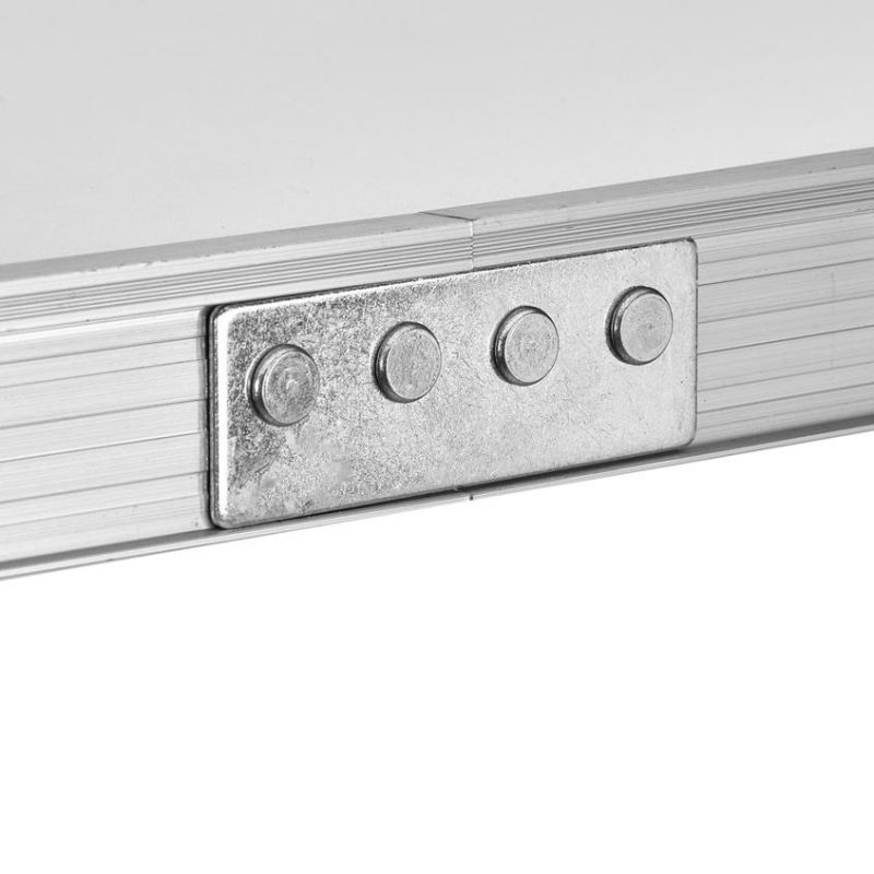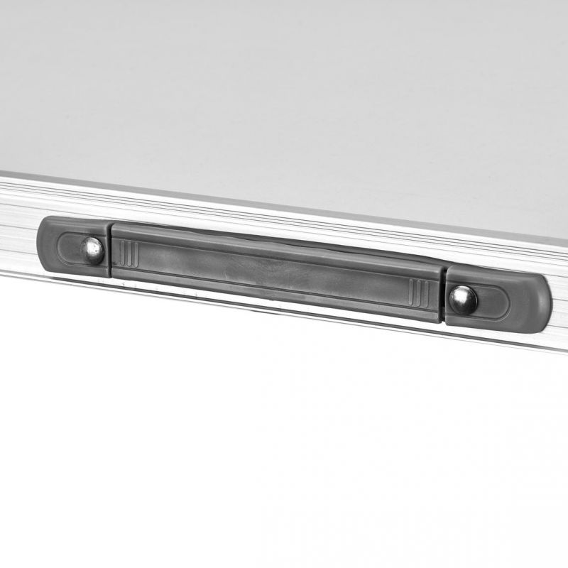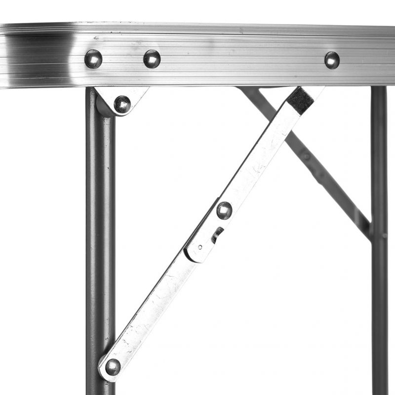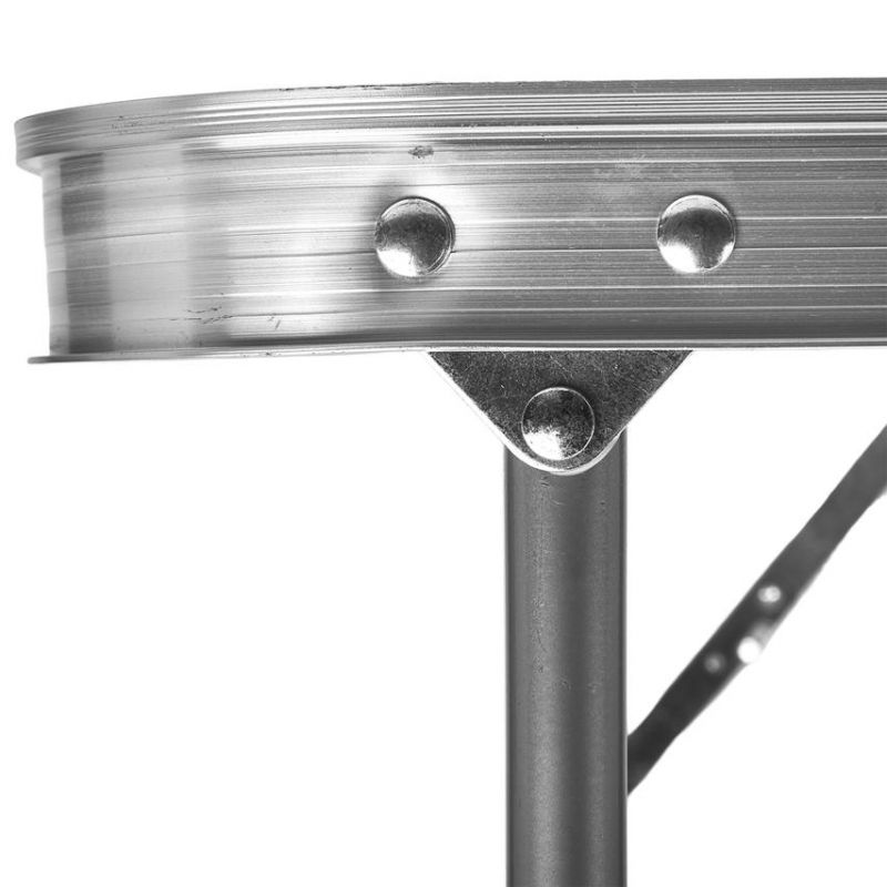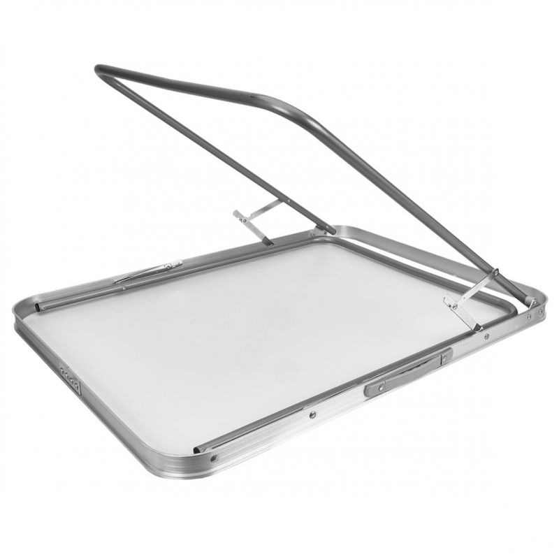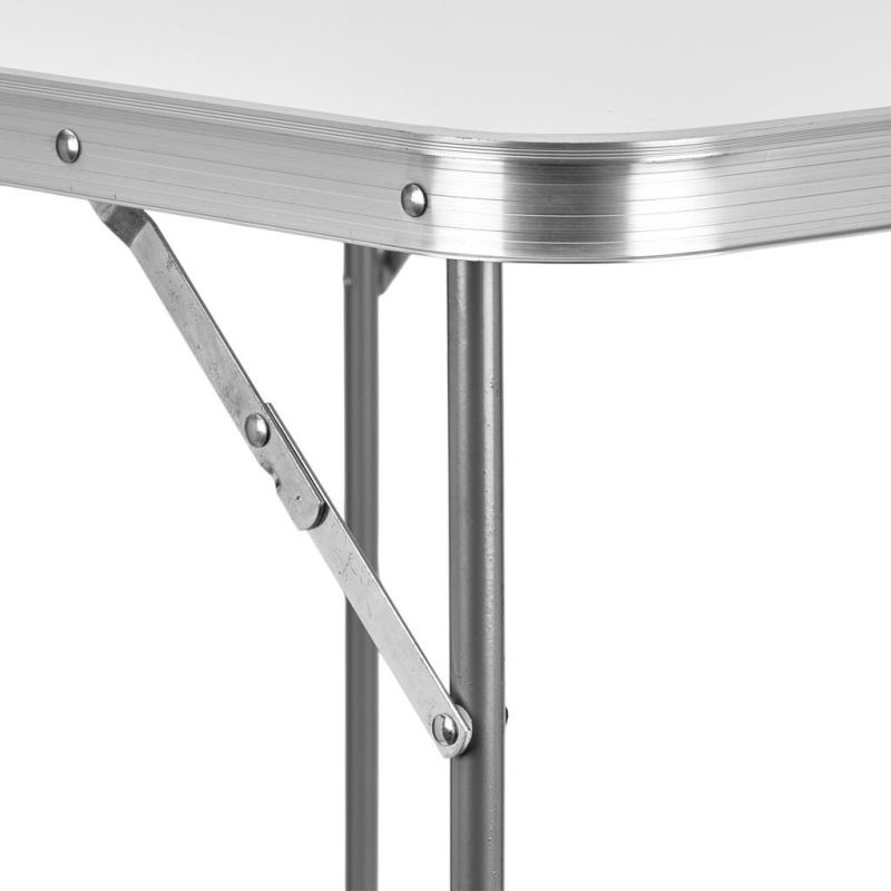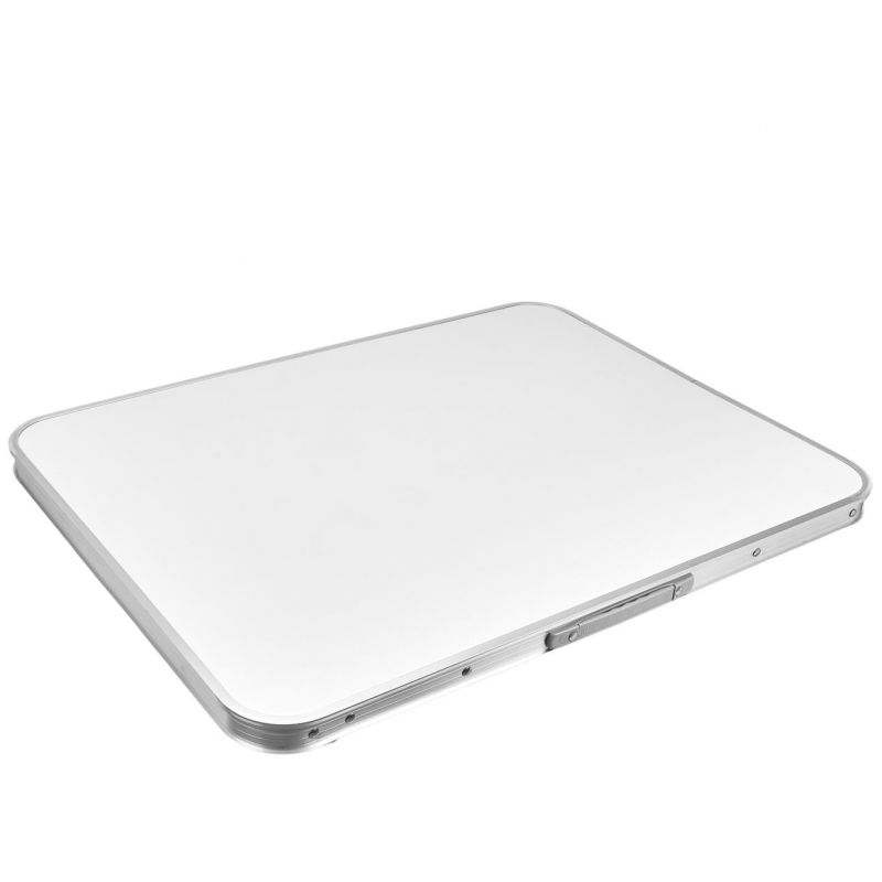 Stolik po rozłożeniu posiada wysokość 69 cm. Maksymalne obciążenie wynosi 30 kg. Blat stolika wykonany został z wysokiej jakości płyty MDF w białym kolorze i został zabezpieczony specjalną, odporną powłoką. Obręcz blatu została wykonana z aluminium w srebrnym kolorze.