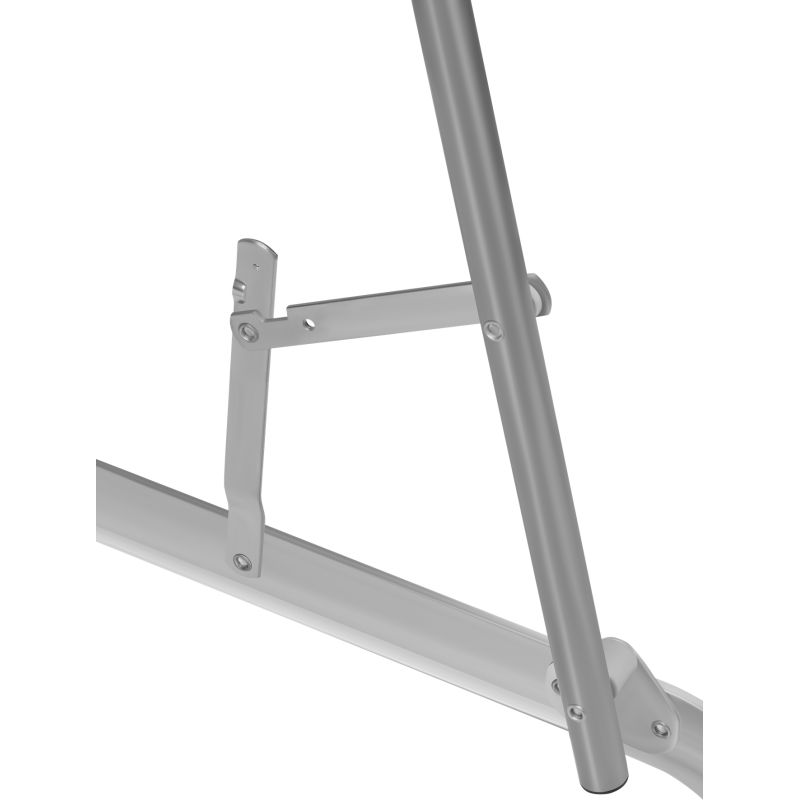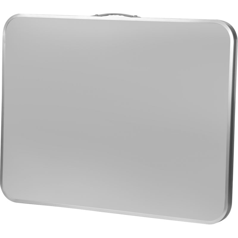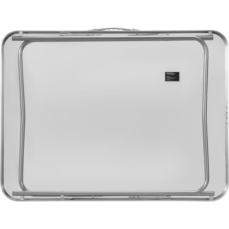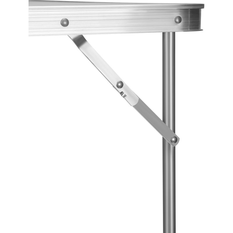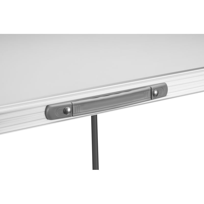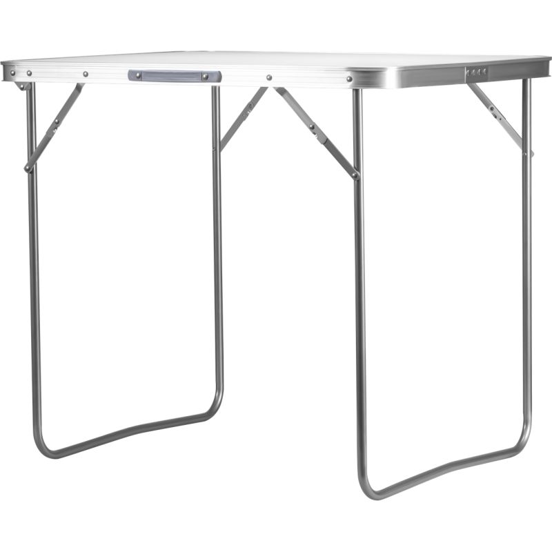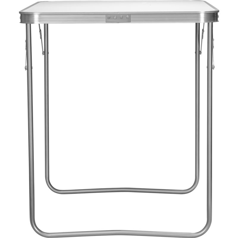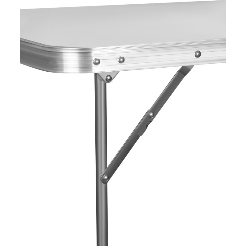 Po rozłożeniu stolik osiąga wysokość 69 cm, co zapewnia komfort pracy w różnych warunkach. Blat wykonany z wysokiej jakości płyty MDF w białym kolorze został zabezpieczony odporną powłoką, a aluminiowa obręcz dodaje mu trwałości i eleganckiego wyglądu. Stabilny metalowy stelaż gwarantuje wytrzymałość oraz odporność na wieloletnie użytkowanie. Maksymalne obciążenie stolika wynosi 30 kg, dzięki czemu bez trudu poradzi sobie z narzędziami, naczyniami i innymi akcesoriami.