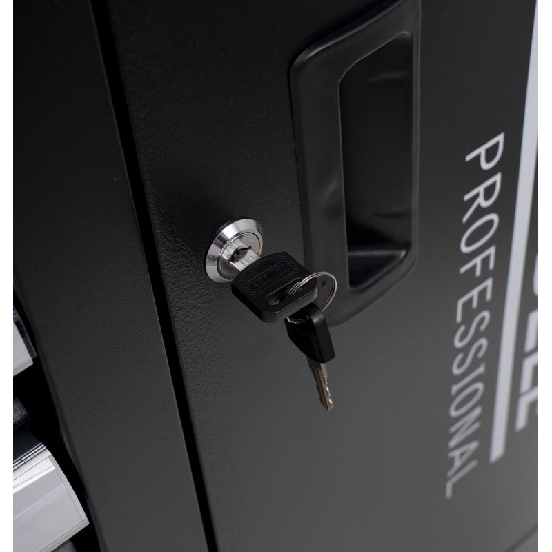 Dzięki solidnej konstrukcji, prowadnicom łożyskowanym, stalowej obudowie i doskonałemu układowi szuflad ta szafka łączy w sobie funkcjonalność, wygodę użytkowania i estetykę. Zastosowane materiały oraz dodatki, jak gumowe odbojniki i blokada szuflad, zapewniają bezpieczeństwo i komfort, nawet przy częstym przemieszczaniu.