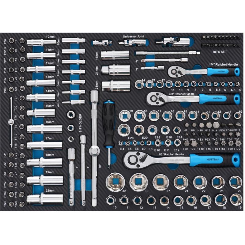 ZAWARTOŚĆ PIERWSZEJ SZUFLADY | Nasadki 1/4" (13 sztuk): 4;4,5;5;5,5;6;7;8;9;10;11;12;13;14; mm Nasadki 3/8" ( 10 sztuk): 10;11;12;13;14;15;16;17;18;19; mm Nasadki 1/2" (17 sztuk): 10;11;12;13;14;15;16;17;18;19;20;21;22;24;27;30;32; mm Nasadki Torx 1/4" (5 sztuk): E4;E5;E6;E7;E8 Nasadki Torx 3/8" (6 sztuk): E10;E11;E12;E14;E16;E18 Nasadki Torx 1/2" (2 sztuki): E20;E24 Długie nasadki 1/4" (7 sztuk): 4;5;6;7;8;9;10; mm Długie nasadki 3/8" (6 sztuk): 10;11;12;13;14;15 mm Długie nasadki 1/2" (5 sztuk): 16;17;18;19;22; mm Przedłużka 1/4" (2 sztuki): 2";4" Przedłużka 3/8" (1 sztuka): 6" Przedłużka 1/2" (2 sztuki): 5";10" Wkrętak 1/2" do nasadek i bitów (1 sztuka): 1/2" Uniwersalne gniazdo przegubowe (3 sztuki): 1/4"; 3/8"; 1/2" Grzechotka (3 sztuki): 1/4";3/8";1/2" Przedłużka elastyczna 1/4" (1 sztuka): 6" Pokrętło typu T (1 sztuka): 1/4" Uchwyty do bitów (3 sztuki): 1/4";3/8";1/2" Nasadki do świec zapłonowych 3/8" (1 sztuka): 21 mm Nasadki do świec zapłonowych 1/2" (2 sztuki): 16mm;21mm Bity nasadowe 1/4 "(25 mm) (30 sztuk): HW2; HW3; HW4; HW5; HW6;FD4; FD5.5;FD7; PH1; PH2; PH3; PZ1; PZ2; PZ3; T8; T9; T10; T15; T20; T25;T 27; T30; TT8; TT9; TT10; TT15; TT20; TT25; TT27; TT30 Bity (30 mm) (24 sztuki): H7; H8; H10; H12; H14; FD8; FD10; FD12; PH3; PH4; PZ3; PZ4; T40; T45; T50; T5.5; T60; T70; TT40; TT45; TT50; TT55; TT60; TT70 Zestaw bitów (25 mm) (10 sztuk): T8; T9; T10; T15; T20; T25; T30; H3; H4; H5 Zestaw bitów (25 mm) (10 sztuk): TT8; TT9; TT10; TT15; TT20; TT25; TT30; FD4; FD 5.5; FD7 |