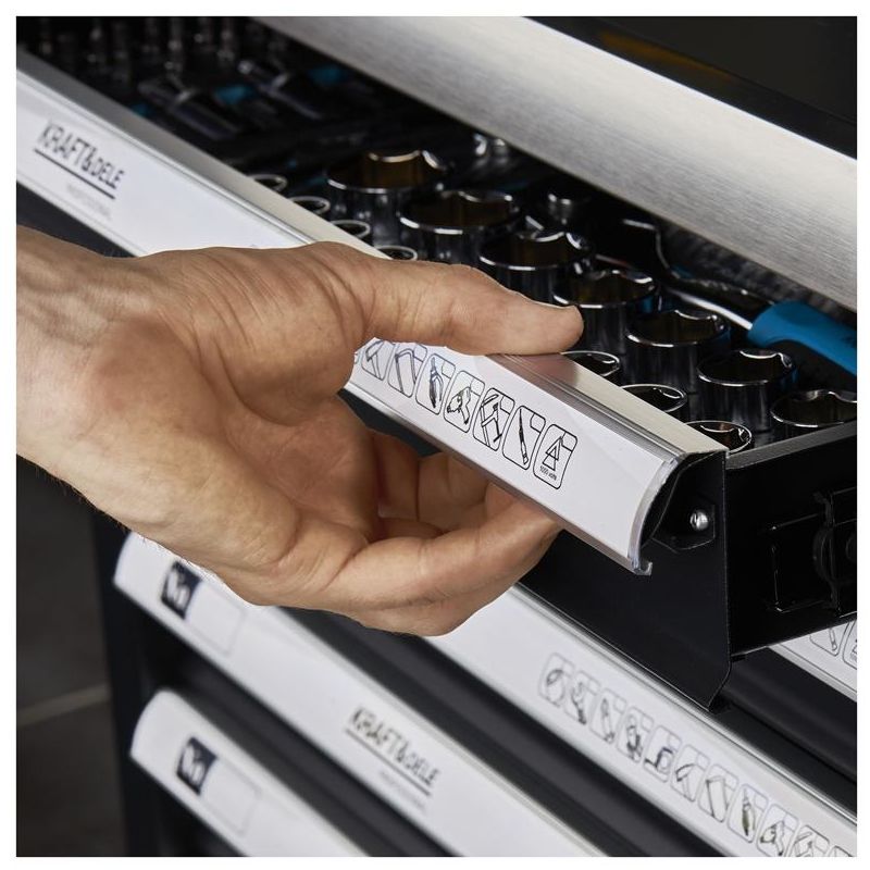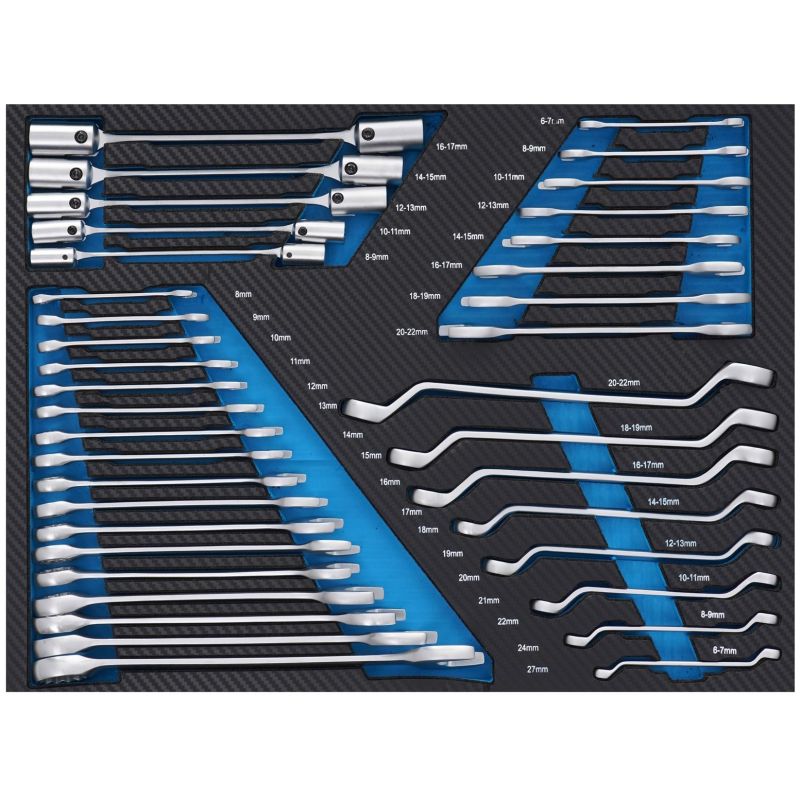 ZAWARTOŚĆ TRZECIEJ SZUFLADY | Obrotowy klucz uchylny (5 sztuk): 8*9;10*11;12*13;14*15;16*17 mm Klucz płaski dwustronny (8 sztuk): 6*7;8*9;10*11;12*13;14*15;16*17;18*18;20*22 mm Klucz oczkowy odgięty (8 sztuk): 6*7;8*9;10*11;12*13;14*15;16*17;18*18;20*22 mm Klucz płasko-oczkowy (17 sztuk): 8;9;10;11;12;13;14;15;16;17;18;19;20;21;22;24;27 mm |