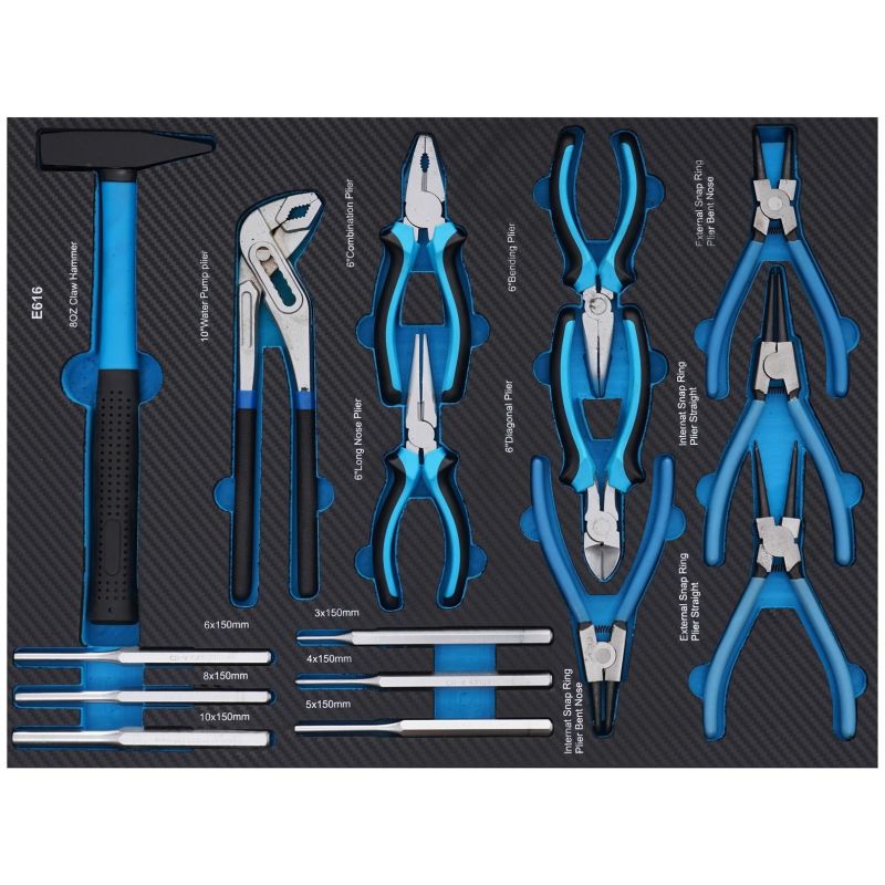 ZAWARTOŚĆ SIÓDMEJ SZUFLADY | Szczypce do pierścieni segera (4 sztuki): 7" Mini szczypce wygięte (1 sztuka): 5" Mini szczypce uniwersalne (1 sztuka): 5" Mini szczypce długie (1 sztuka): 5" Mini szczypce ukośne (1 sztuka): 5" Szczypce uniwersalne (1 sztuka): 6" Kombinerki wydłużone (1 sztuka): 6" Szczypce do cięcia (1 sztuka): 6" Szczypce zaciskowe Morse'a (1 sztuka): 10" Szczypce nastawne (1 sztuka): 10" Młotek 250g |