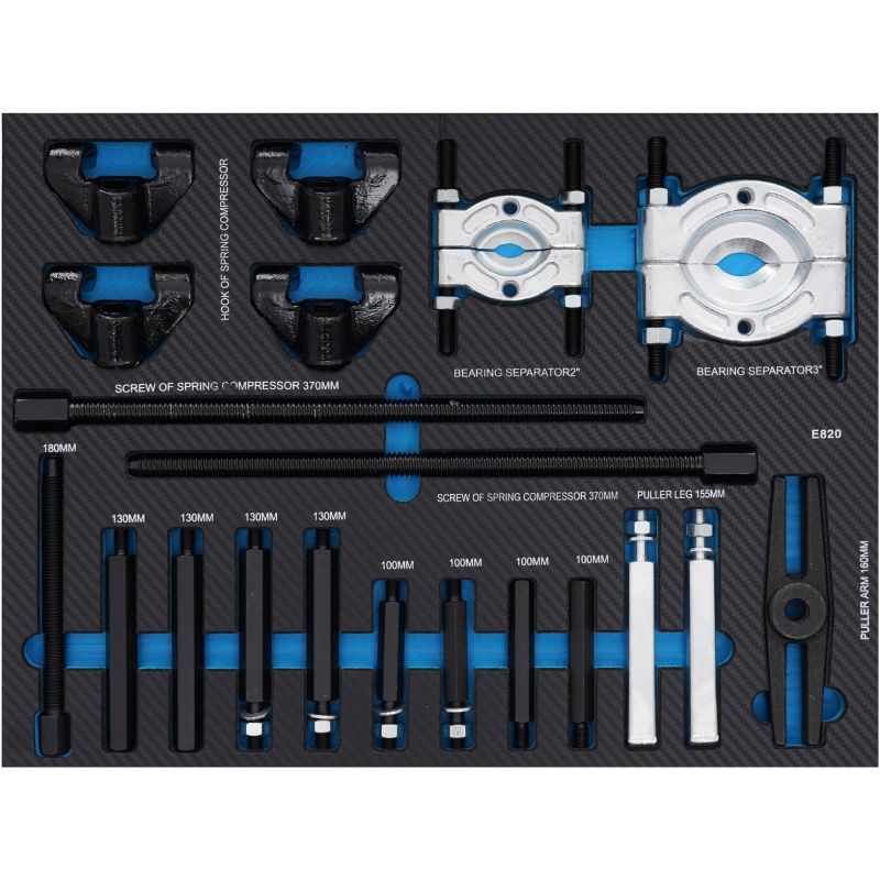 ZAWARTOŚĆ DRUGIEJ SZUFLADY | awiera m.in ściągacze do sprężyn. Dostosowane do wszystkich typów sprężyn w kolumnach McPhersona oraz sprężyn niezależnych. W szufladzie znajdują się także ściągacze do łożysk. |