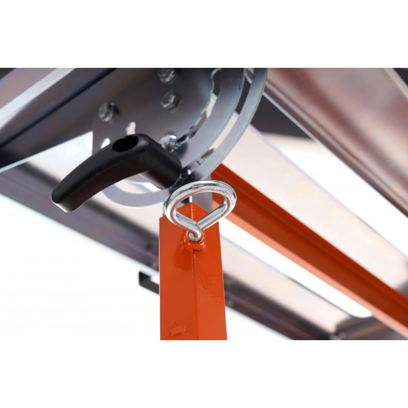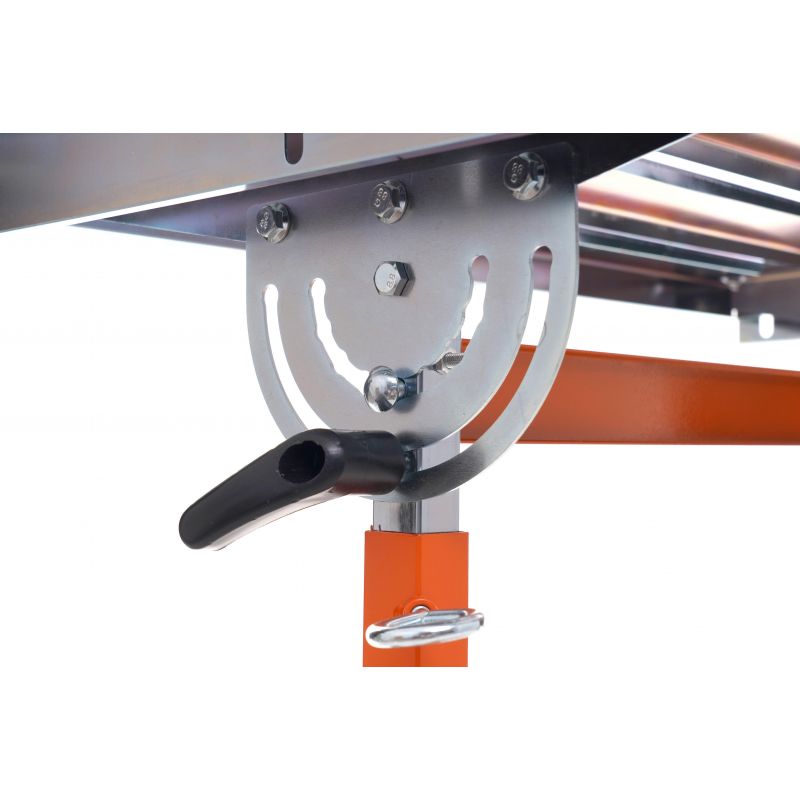 Model KD1179 wyróżnia się stalową konstrukcją oraz ocynkowanym blatem roboczym, co znacząco zwiększa odporność na rdzę i wydłuża czas użytkowania stołu. Dodatkowym atutem jest możliwość regulacji kąta pochylenia, ułatwiająca dopasowanie pozycji roboczej do konkretnego zadania. Na blacie znajdują się chowane prowadnice krawędziowe, które można wykorzystać jako ograniczniki lub do mocowania obrabianych elementów. Konstrukcja umożliwia także dołączanie dodatkowych stołów, aby uzyskać większą powierzchnię roboczą.