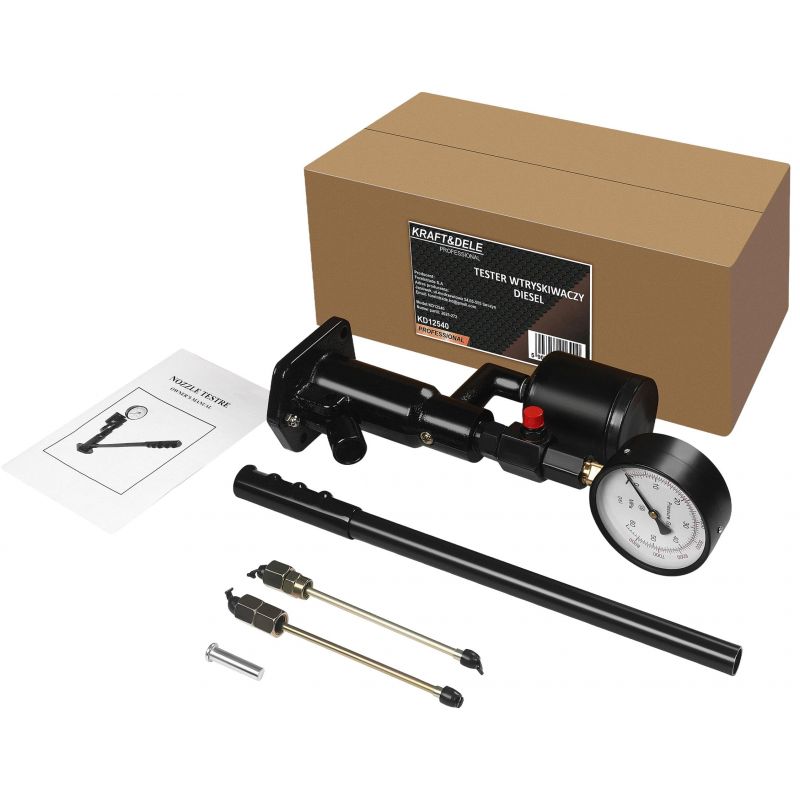 Próbnik umożliwia testowanie wtryskiwaczy typu Common Rail oraz TDI, zapewniając możliwość pracy przy ciśnieniu testowym do 600 BAR. Wbudowany, precyzyjny manometr ułatwia kontrolę parametrów podczas testu, a solidna metalowa konstrukcja sprawia, że narzędzie dobrze znosi intensywną eksploatację w warunkach warsztatowych. Kompaktowe wymiary ułatwiają transport i przechowywanie, dzięki czemu KD12540 jest praktycznym rozwiązaniem zarówno do warsztatu, jak i pracy mobilnej.