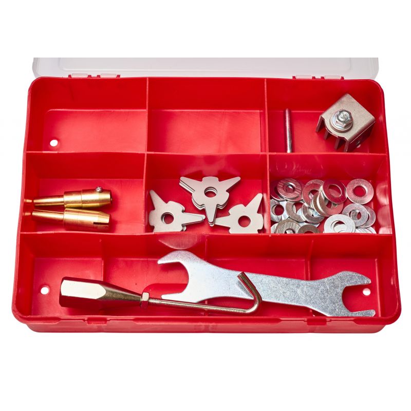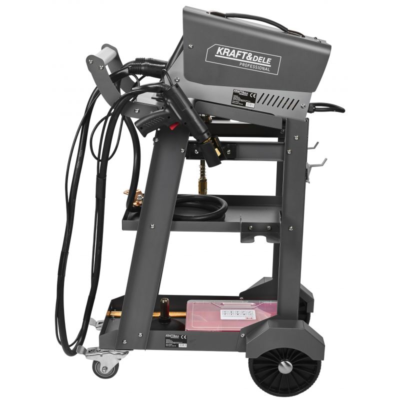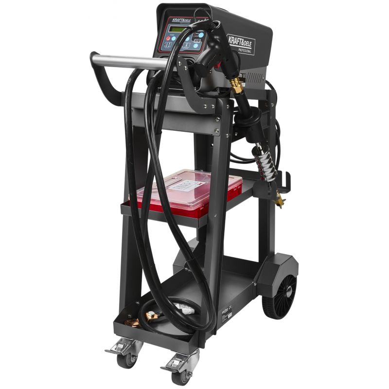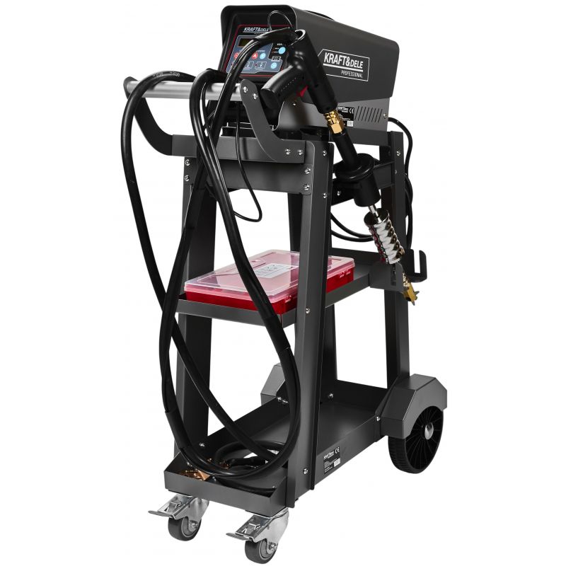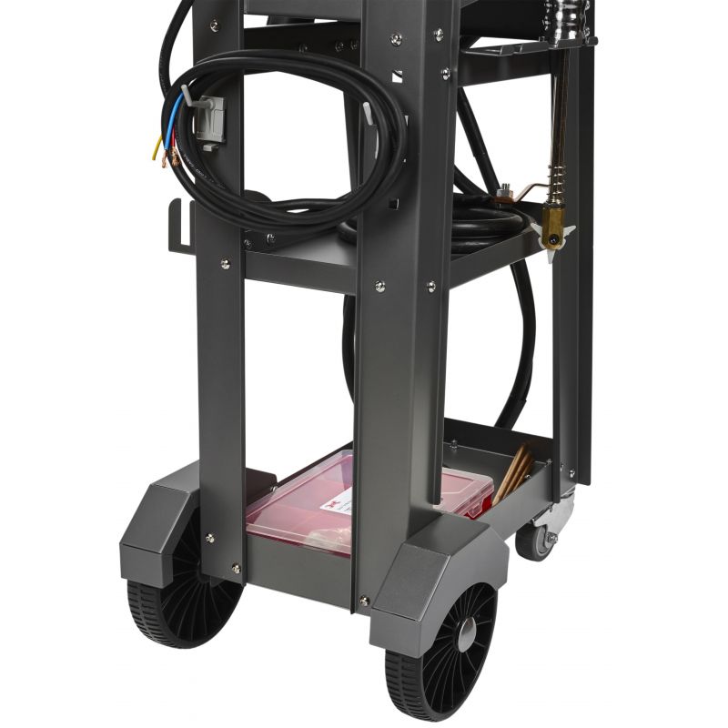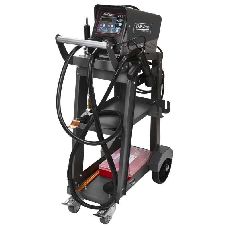 Urządzenie jest wyposażone w kubełek próżniowy o udźwigu 190 kg oraz stabilny wózek z 4 kołami, w tym 2 skrętnymi z hamulcem, co ułatwia przemieszczanie i stabilne ustawienie w warsztacie. Bogaty zestaw akcesoriów pozwala na pełne wykorzystanie możliwości spottera przy naprawach karoserii i pracach blacharskich, w tym spawanie podkładek trójkątnych, zwykłych, spawanie śrub, cięcie elektrody węglowej, spawanie jednostronne, podgrzewanie elektrody węglowej, spawanie drutem falistym, spawanie podkładek OT oraz przyssawka próżniowa.