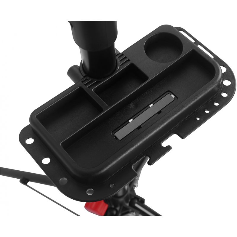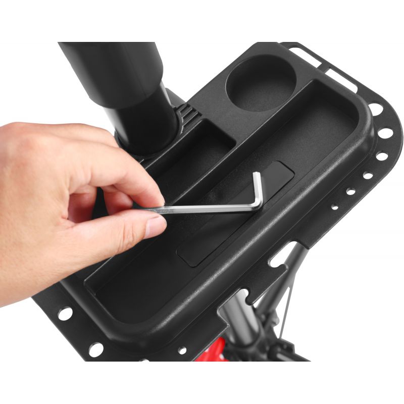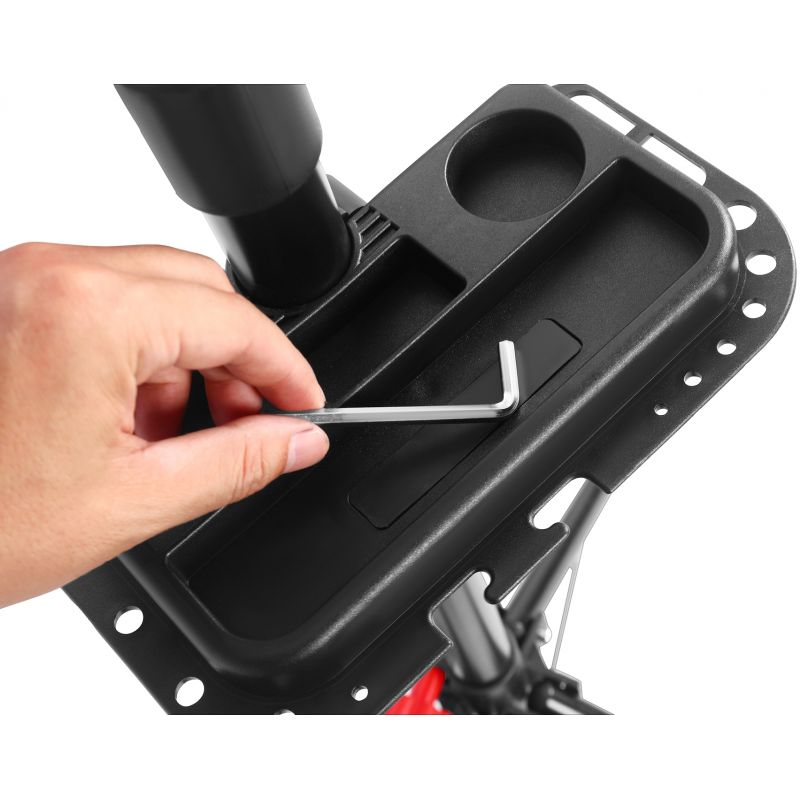 Regulowana wysokość stojaka oraz szczęki pokryte gumą chronią ramę roweru przed zarysowaniami. Wbudowana półka na narzędzia i śruby z magnesem pozwala mieć wszystko pod ręką, co znacznie ułatwia pracę serwisową.