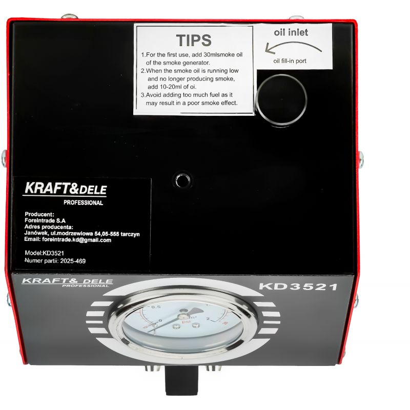 Generator dymu KRAFT&DELE KD3521 to profesjonalne urządzenie diagnostyczne do wykrywania nieszczelności w systemach rurowych pojazdów i instalacjach technicznych. Umożliwia szybkie, bezpieczne i precyzyjne zlokalizowanie wycieków w układach takich jak: system EVAP, układ dolotowy, wydechowy, paliwowy, chłodzenia czy przewody podciśnienia.
