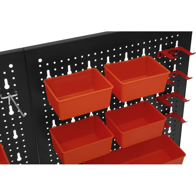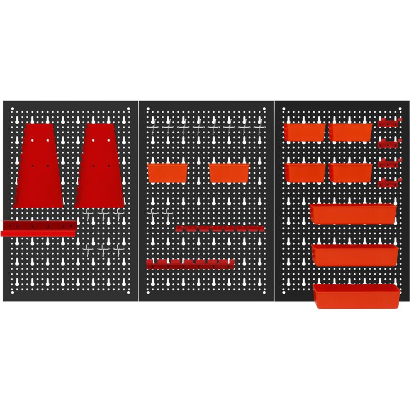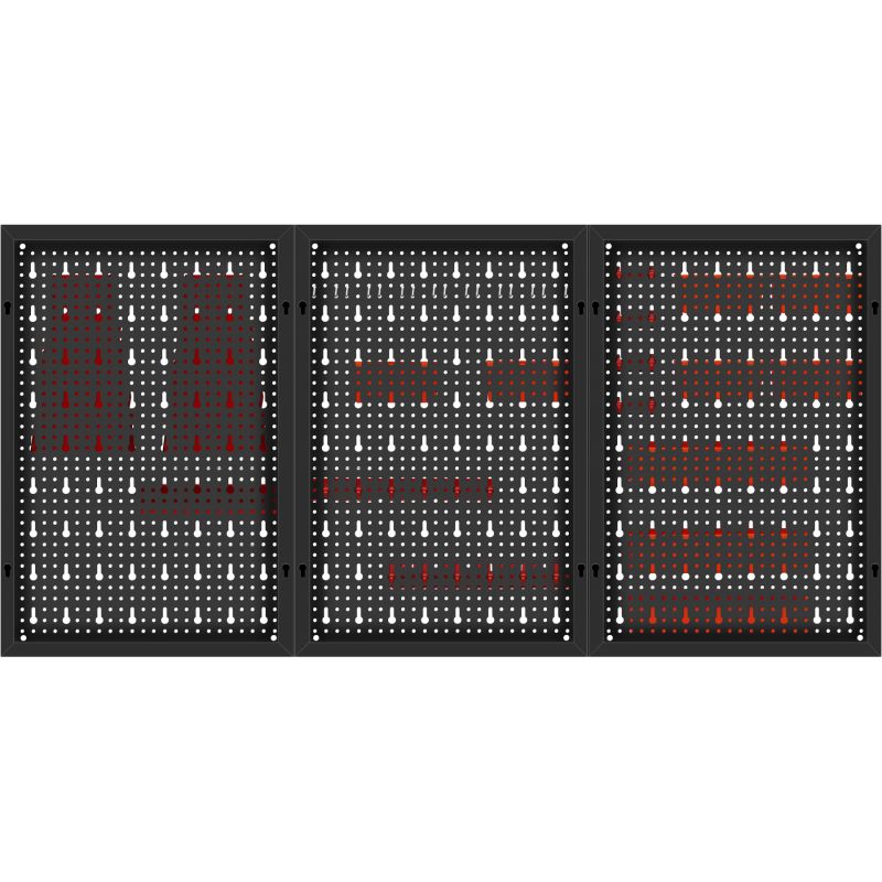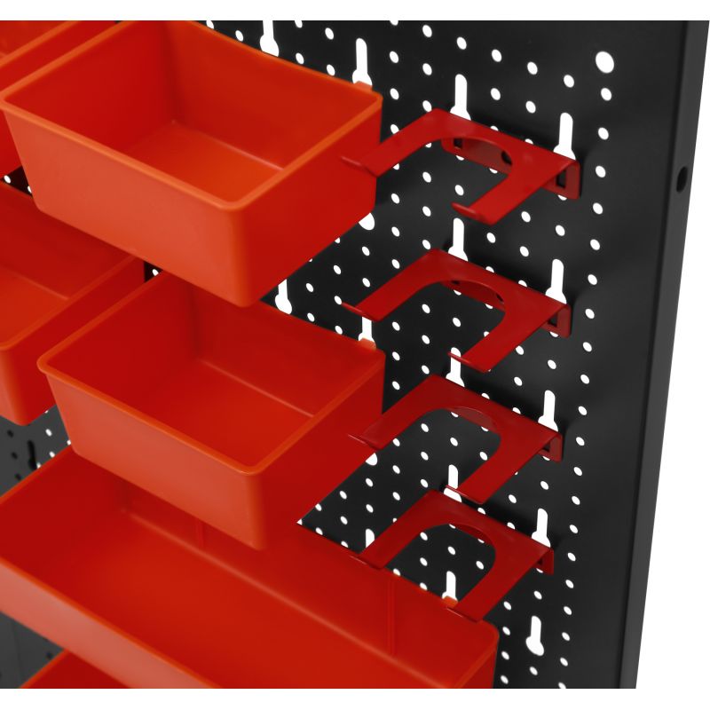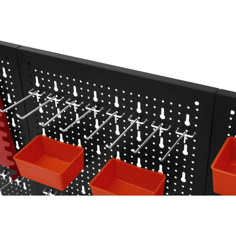Metalowa konstrukcja zapewnia trwałość oraz stabilność, a perforowana powierzchnia umożliwia łatwy montaż wieszaków, haczyków i pojemników. Zestaw akcesoriów pozwala na praktyczną organizację narzędzi ręcznych, elementów montażowych oraz drobnych akcesoriów, zwiększając komfort pracy i utrzymanie porządku w miejscu roboczym.