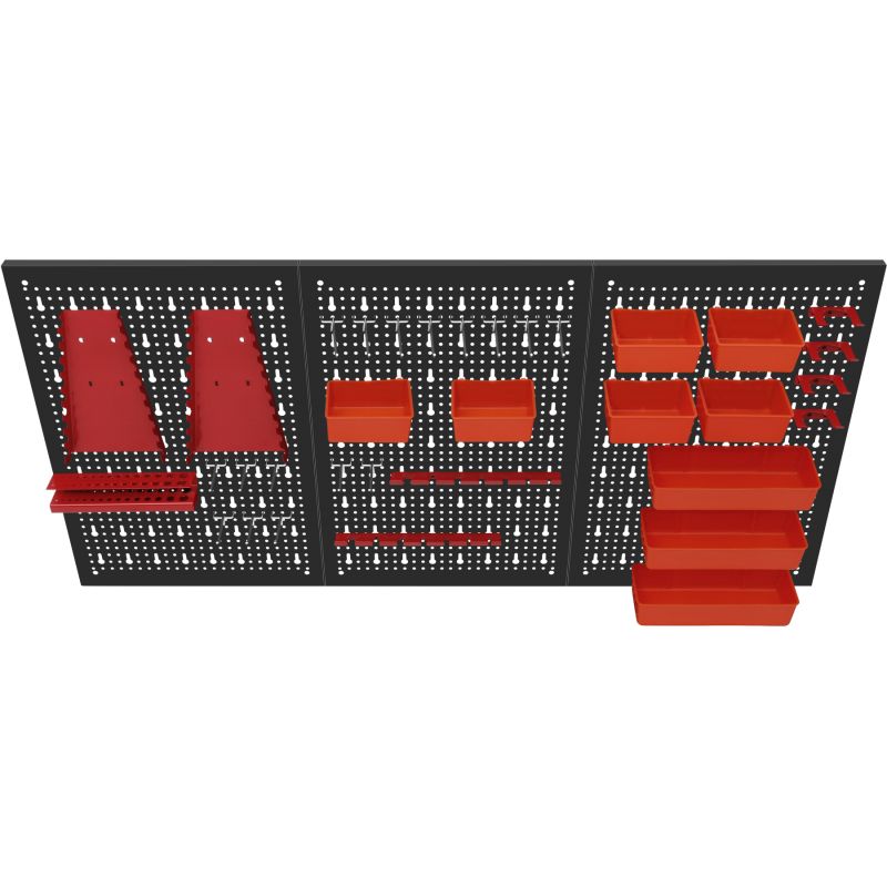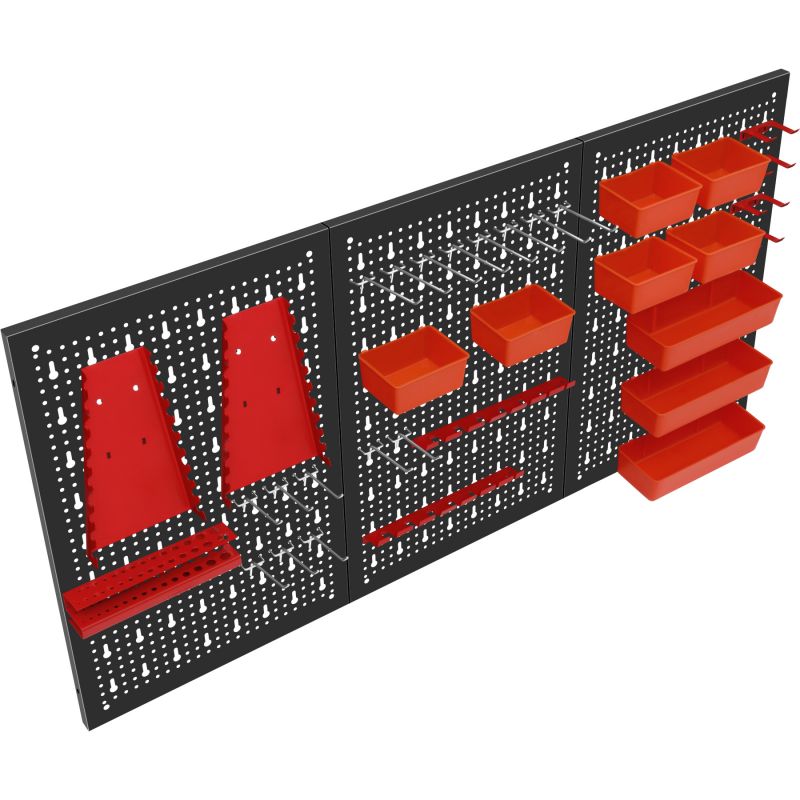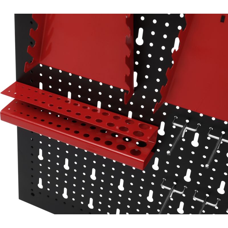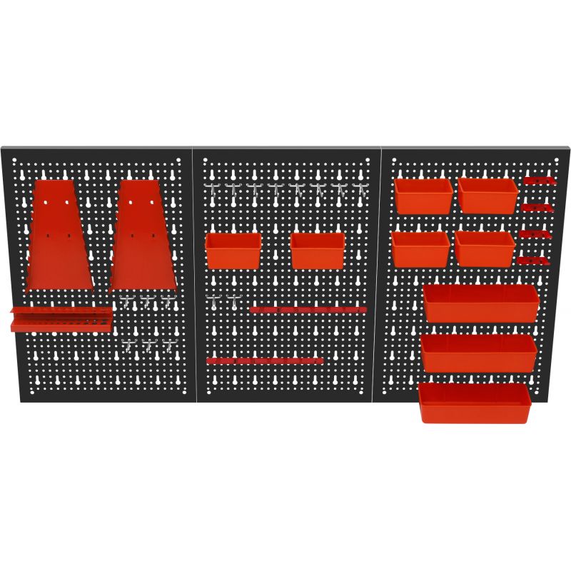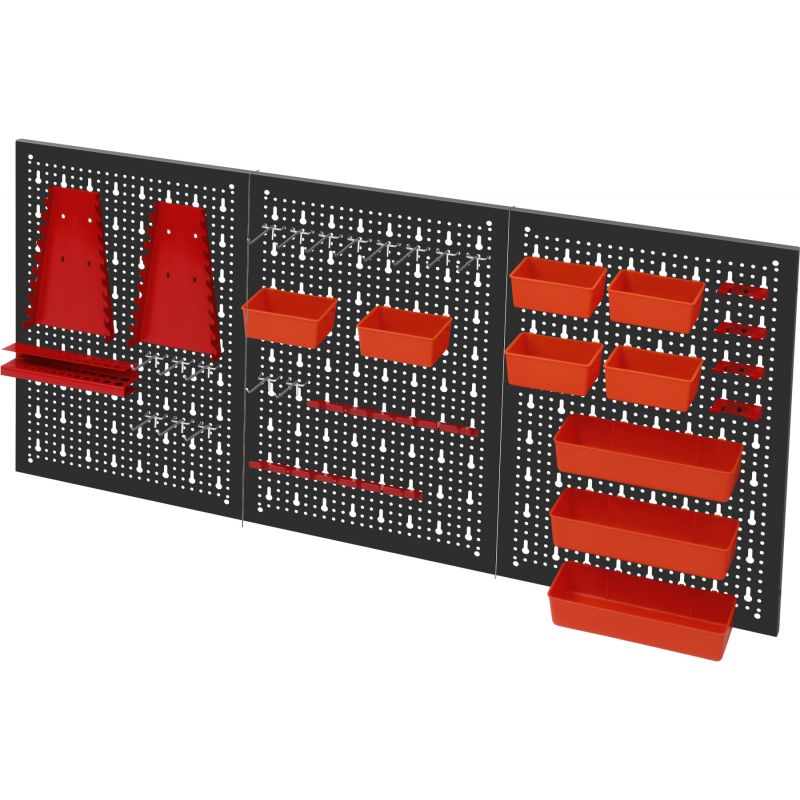 Metalowa konstrukcja zapewnia trwałość oraz stabilność, a perforowana powierzchnia umożliwia łatwy montaż wieszaków, haczyków i pojemników. Zestaw akcesoriów pozwala na praktyczną organizację narzędzi ręcznych, elementów montażowych oraz drobnych akcesoriów, zwiększając komfort pracy i utrzymanie porządku w miejscu roboczym.