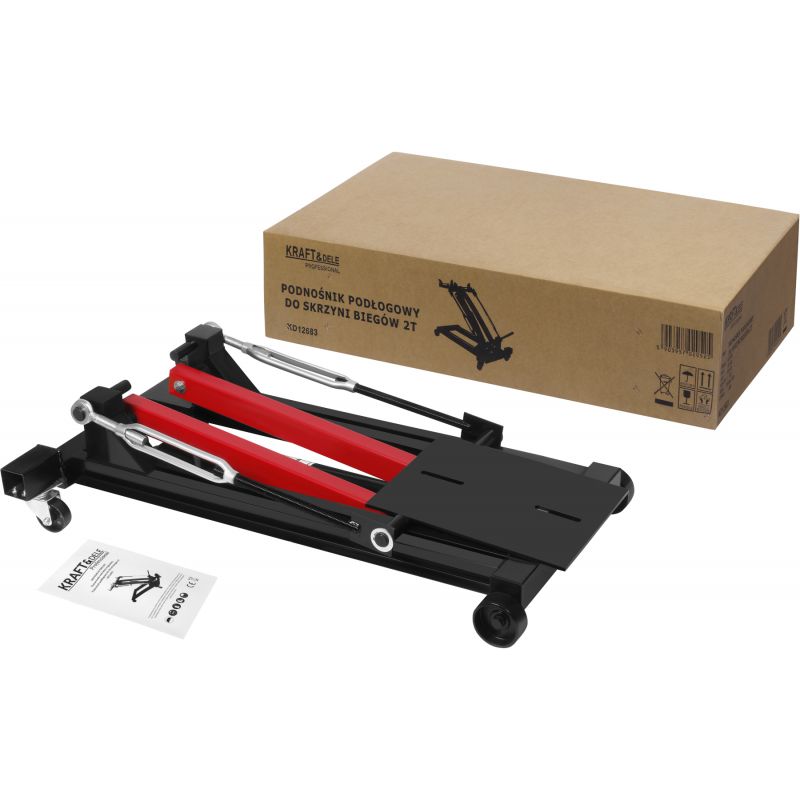 KD12683 to hydrauliczny podnośnik podłogowy marki KRAFT&DELE, przeznaczony do wspomagania montażu oraz demontażu skrzyń biegów, przekładni różnicowych i innych elementów układu napędowego. Solidna stalowa konstrukcja w połączeniu z wydajnym układem hydraulicznym o udźwigu do 2000 kg sprawia, że urządzenie sprosta oczekiwaniom nawet najbardziej wymagających użytkowników.