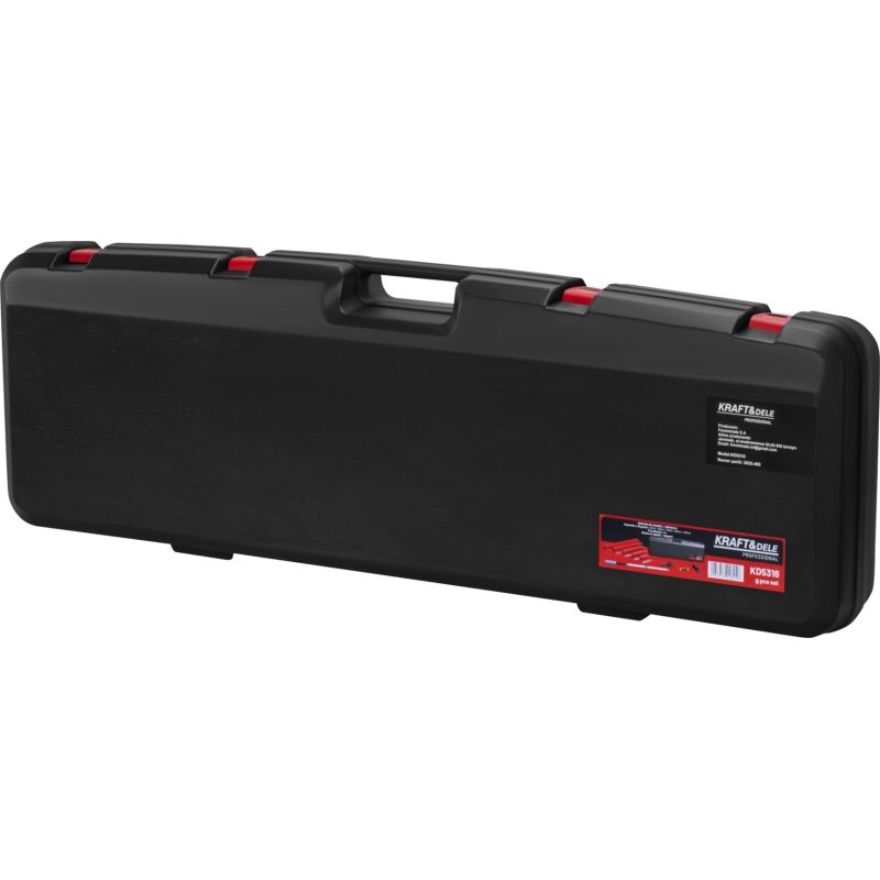 Zestaw KD5316 zawiera szpachle w czterech rozmiarach, przedłużkę 2 m, wałek do gładzi oraz adapter umożliwiający pracę pod różnym kątem. Przedłużka ułatwia pracę w wysokich pomieszczeniach bez użycia drabin. Miękka pianka na końcu kija zwiększa komfort pracy, a lekki korpus szpachli zmniejsza obciążenie.