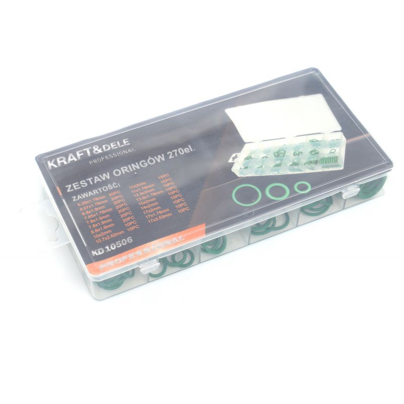 KD10506 marki KRAFT&DELE to kompletny zestaw 270 sztuk olejoodpornych oringów, przeznaczonych do uszczelniania połączeń w instalacjach hydraulicznych, pneumatycznych oraz motoryzacyjnych. Sprawdzą się w warsztacie, serwisie mechanicznym oraz przy pracach montażowych i naprawczych.